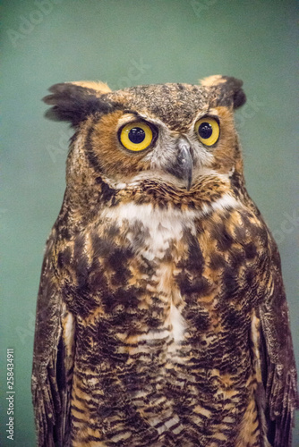 Fototapeta premium A Screech Owl in rehab sitting on a handler's glove.