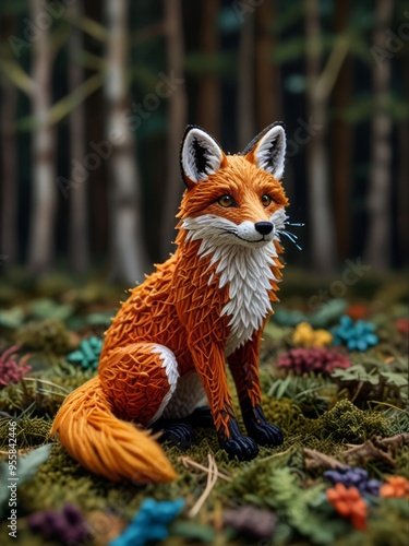 © YudhiaAsta, Fototapeta premium A Sculpted needlework Fox in a Woodland Setting