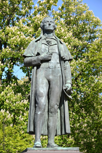 © vodolej, Fototapeta premium A sculpture by the German poet Friedrich Schiller (1759-1805) against the background of flowering chestnuts. Kaliningrad