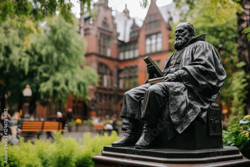 © Sanchai, Fototapeta premium A sculpture of a famous philosopher in an old European university courtyard