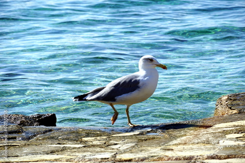 © Happy window, Obraz premium A sea gull on a rocky shore behind which is a blue sea shore