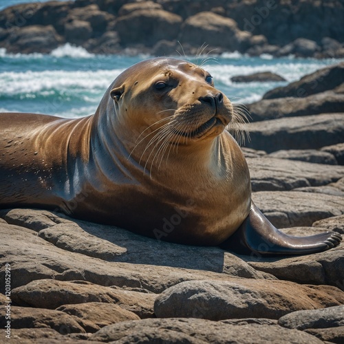 Fototapeta premium A sea lion basking in the sun on a rock. A playful seal lounging on a sunlit...