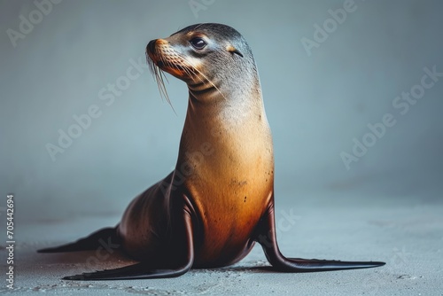 © Duka Mer, Fototapeta premium A sea lion, its look proud and attractive, sits on a cement floor, posing majestically.