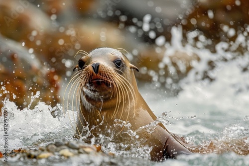 Obraz premium A sea lion joyfully swimming and splashing in a body of water, A playful sea...