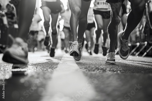 Fototapeta premium A sea of legs and sneakers rush towards the finish line, capturing the energy...
