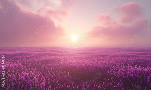 © Valentyna, Fototapeta premium A sea of purple magenta flowers stretching across the horizon of a sun-drenched field meadow, magenta, field