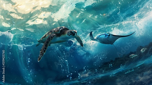 Fototapeta premium A sea turtle and a manta ray gliding together under the sparkling surface of...