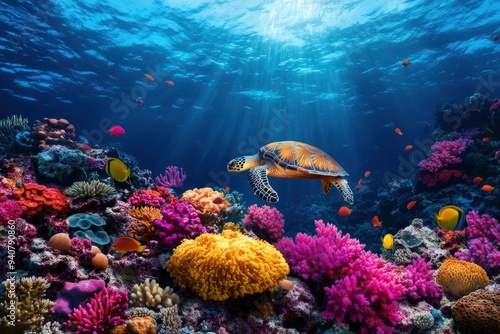 Fototapeta premium A sea turtle gracefully swims above a diverse and colorful coral reef, bathing in rays of sunlight penetrating the clear blue waters of the ocean.