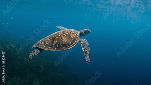 Fototapeta premium A sea turtle gracefully swims through the clear blue ocean water with...