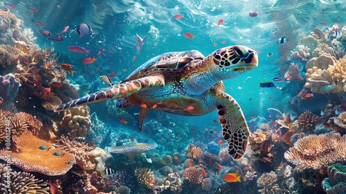 Fototapeta premium A sea turtle nesting among the coral formations, surrounded by a cloud of...
