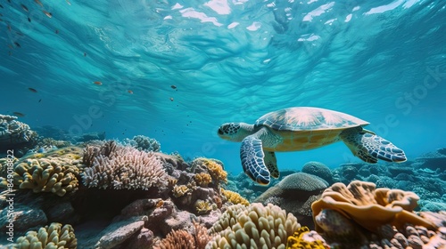 Naklejka premium A sea turtle swimming over a vibrant coral reef in clear blue water.