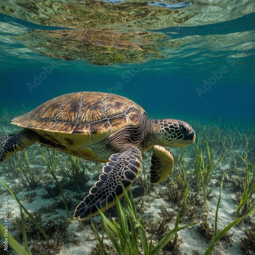 © Muhammad, Fototapeta premium A sea turtle swimming through a bed of seagrass.
