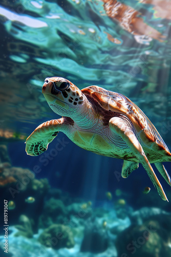 © Oleksandr, Fototapeta premium A sea turtle swimming under clear water