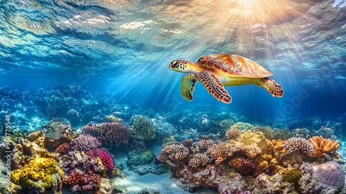 Obraz premium A sea turtle swims through a vibrant coral reef, illuminated by the sun's rays.