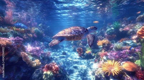 Fototapeta premium A sea turtle swims through vibrant coral reef with colorful fish.