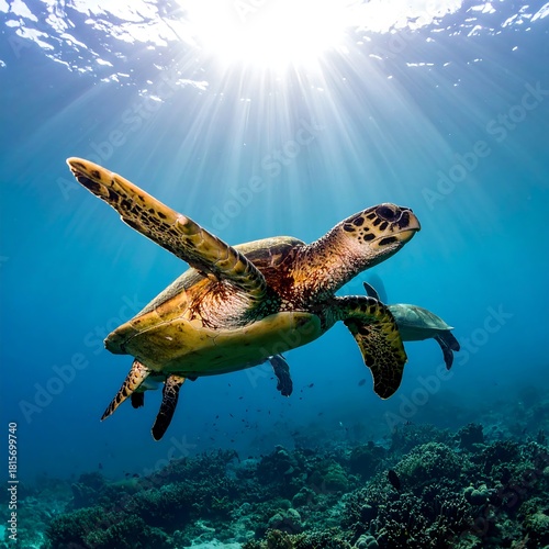 Obraz premium A sea turtle swims towards the light in an underwater scene