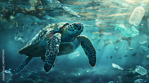 Obraz premium A sea turtle tangled in plastic debris swimming through a polluted ocean,...
