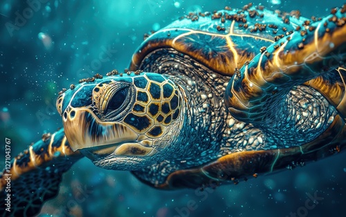 Fototapeta premium A sea turtle with barnacles on its shell in deep water