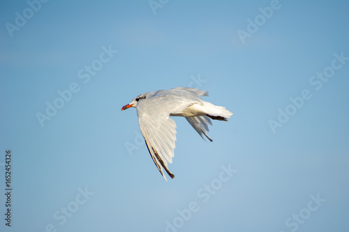 Fototapeta premium A seabird with a red beak soars gracefully through a clear blue sky.