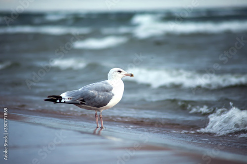 Fototapeta premium A seagull bird on the beach at sunset