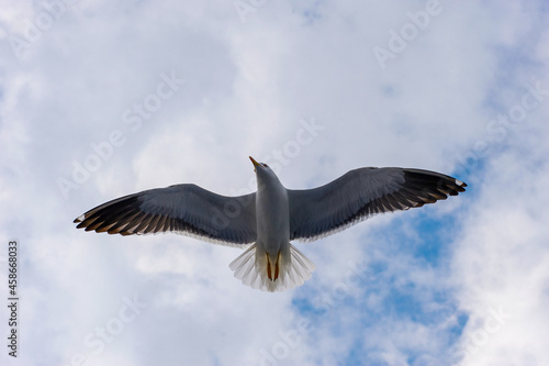 © Mikhail, Obraz premium A seagull flies in the sky with clouds.