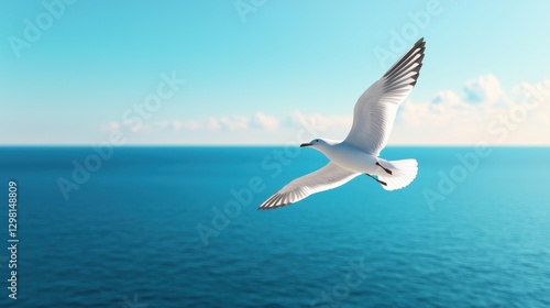 Fototapeta premium A seagull gracefully soars above the serene blue ocean under a bright sky,...