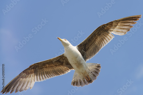 © Yury and Tanya, Fototapeta premium A seagull hovering over the ocean