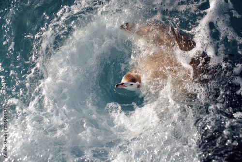 Naklejka premium A seagull immerses itself in the turbulent ocean waves, capturing the essence...