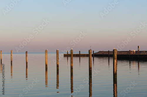 © PeSchne, Obraz premium A seagull in the evening in the harbor