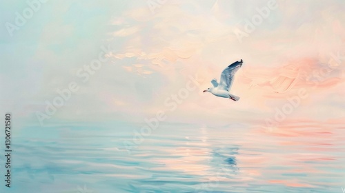© isend, Obraz premium A seagull is flying over the water in a colorful sky