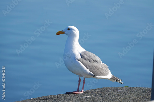 © Henk, Fototapeta premium A seagull standing on a rocky platform by the water's edge, showcasing its white and gray plumage against a blue backdrop.