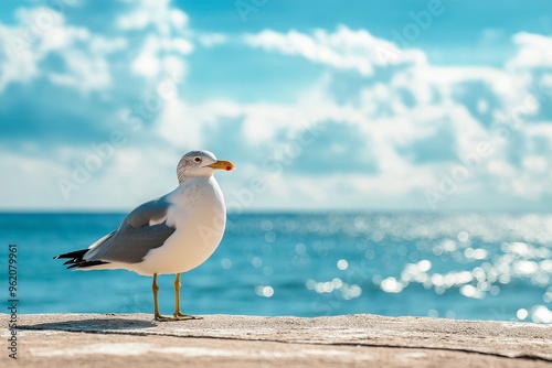 Fototapeta premium A seagull standing on a shore with a vibrant blue ocean and clear sky in the...