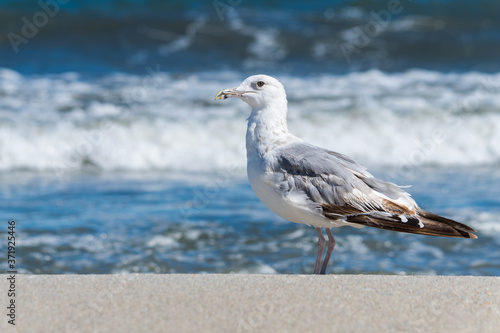 Fototapeta premium A Seagull Standing on the Beach and Waiting for the Next Wave