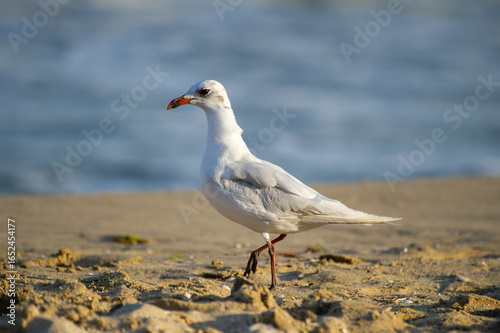 Fototapeta premium A seagull with a red beak and legs stands calmly on a sandy beach with the...