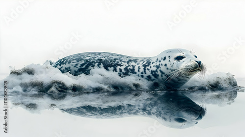© DudeDesignStudio, Obraz premium A seal resting on a calm surface with a reflective background.