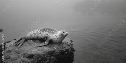 © Ева Поликарпова, Obraz premium A seal sitting on top of a rock in the water. Suitable for nature and wildlife themes