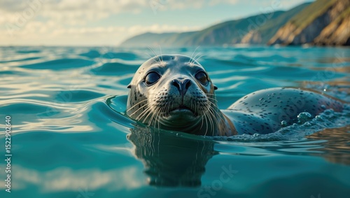 © Lasvu, Fototapeta premium A seal sticking its head above water while swimming along the west coast.