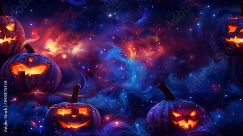 © LuvTK, Naklejka premium A seamless cartoon pattern of Jack-o'-Lanterns with a variety of facial expressions, glowing softly, surrounded by twinkling stars and swirling mist, on a deep indigo background. --ar 16:9 --v 6.