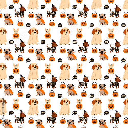 © Svutlana , Obraz premium a seamless Halloween-themed pattern featuring cartoon dogs in costumes — including a pug vampire, a ghost dog, a dachshund skeleton witch, and a French bulldog pumpkin — along with jack-o-lantern buck