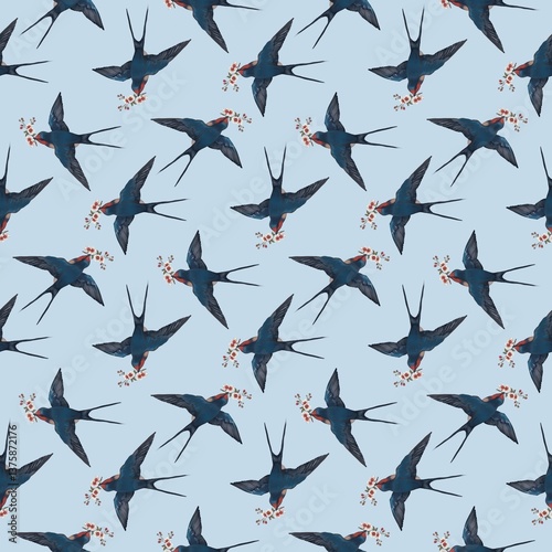 Fototapeta premium A seamless pattern featuring elegant swallows in flight, each carrying a...