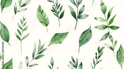Naklejka premium A seamless pattern featuring green watercolor leaves intricately arranged on a white background. Perfect for nature-inspired designs, wallpapers, and fabric prints.