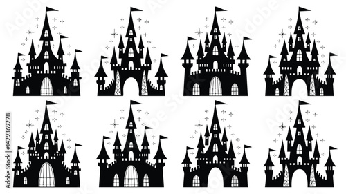 © Mahfuz, Obraz premium A seamless pattern featuring six stylized castle silhouettes