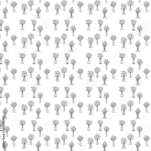 Fototapeta premium A seamless pattern of black-and-white line art flower arrangements in vases,...