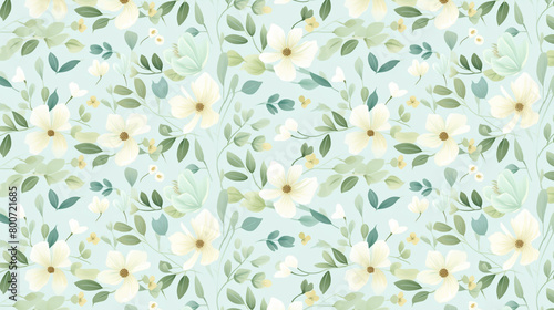 © FoxGrafy, Fototapeta premium A seamless pattern of cream and white flowers and sage green leaves on a pale blue background.