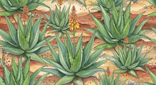 © Djumiati, Fototapeta premium A seamless pattern of hand-drawn aloe vera succulent plants with orange blossoms on a sandy background