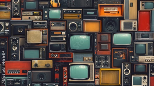 © 69, Obraz premium A seamless pattern of retro electronics like TVs, amplifiers, and radios, stacked together. The image serves as a unique background with a nostalgic touch