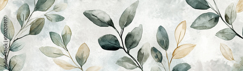 © Nishat, Fototapeta premium A seamless pattern with digital watercolor leaves in soft greens and golds, their forms layered against each other on a grey background.