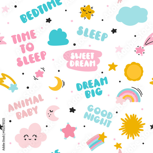 Naklejka premium A seamless pattern with stars, moon, and clouds and words for sleeping. For...