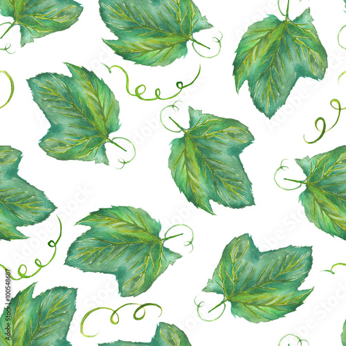 © nastyasklyarova, Fototapeta premium A seamless pattern with the hand-drawn grape leaves. Painted in a watercolor on a white background.