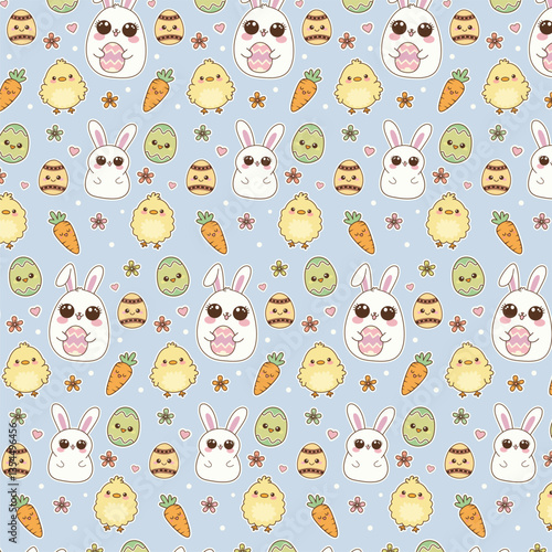 Fototapeta premium A seamless, repeating pattern featuring cute, cartoon-style Easter-themed elements